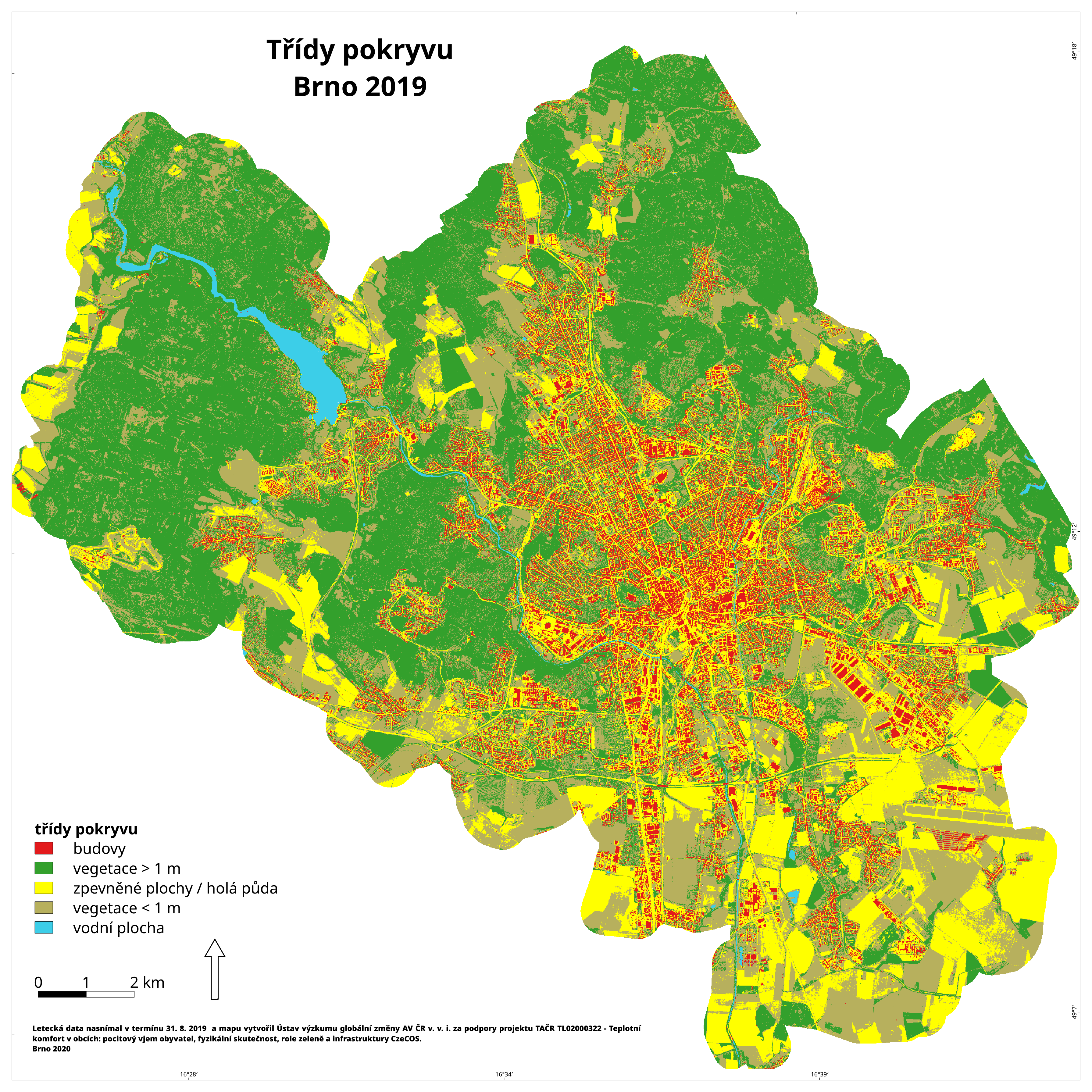 Klasifikace tříd pokryvu: budovy, vegetace > 1 m, vegetace < 1 m, komunikace, vodní plocha, zpevněné plochy + holá půda.