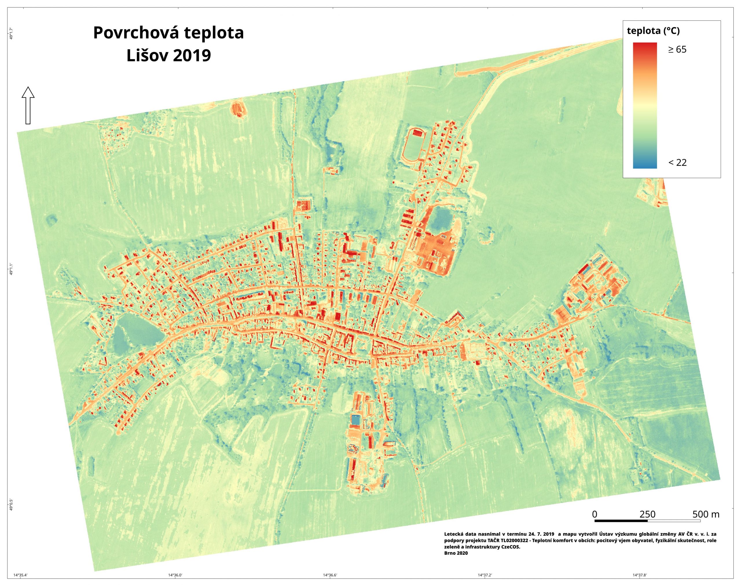 Lišov povrchová teplota269 DownloadsTeplota povrchů (°C) v den snímání leteckých dat – 24. 7. 2019. Download Now!